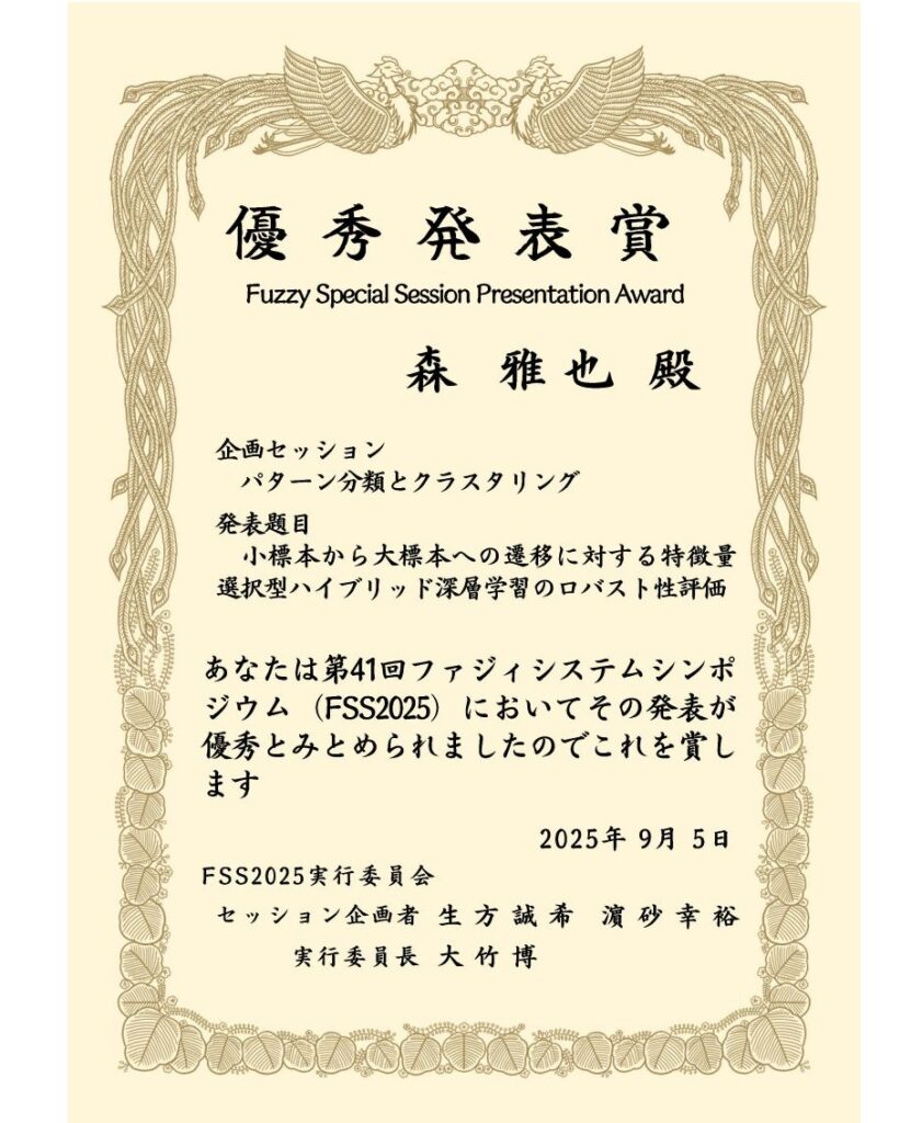 2025年9月3-5日に開催されましたファジィ システム シンポジウム(FSS2025)にて、日本大学大学院生産工学研究科マネジメント工学専攻博士後期課程2年の森 雅也さんがFSS優秀発表賞を受賞しました。